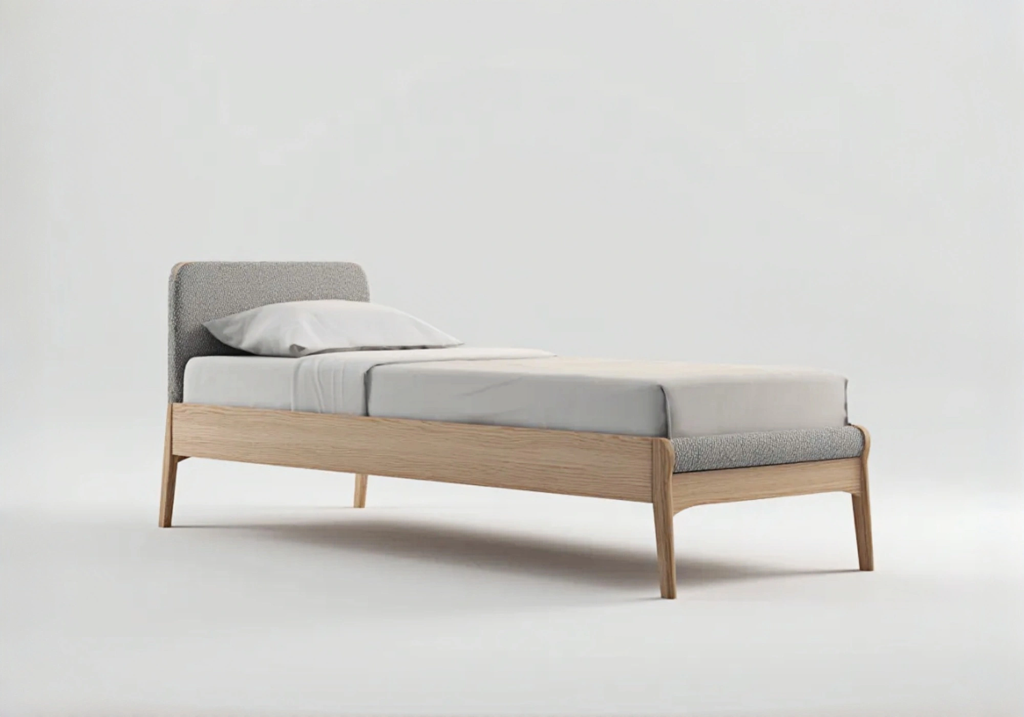 Ce lit simple est compatible avec un matelas standard et dispose d'une tête de lit tapissée apportant un confort supplémentaire lors de la lecture ou du repos. Sa conception compacte facilite l'intégration dans différents espaces de chambre.